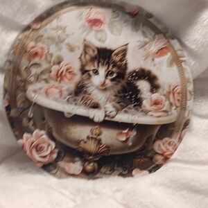 Charming decorative plate featuring a cute kitten surrounded by roses. Perfect for cat lovers and collectors.