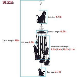 UNIQUE DESIGN: The YMXBL Cat wind bells is equipped with 1 large metal cat, 1 round metal cover, 4 aluminum tubes, 6 bells and 6 small cats. From hook to bottom Overall unit measures approximately 35 inch.