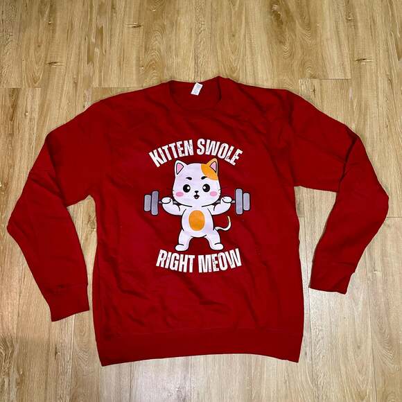 This "Kitten Swole Right Meow" sweatshirt is a purr-fect gift for any cat lover and gym enthusiast. Featuring an adorable cat lifting weights, this comfortable crewneck combines humor and feline charm. Made from a soft, durable blend, it's ideal for casual wear, gym sessions, or cozy nights in. Excellent pre-owned condition, no stains or damage. Show your love for cats and fitness with this unique graphic sweatshirt!