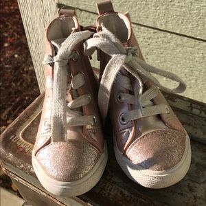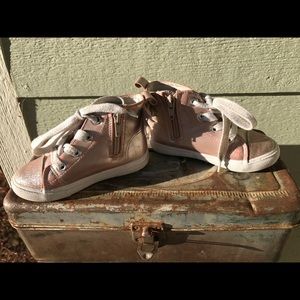 Glitter toe and rose-gold shiny metallic sneakers. Size 7 toddler. Cute bow in the back.