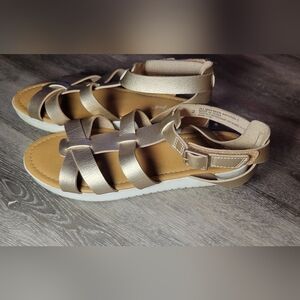 Gently used cat and jack girls size 2 sandals. the only wear is on the front. color is a beautiful gold that pairs with anything.