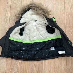 Cat and Jack snow jacket size 3T gray with green detail fur-hood zipper pockets