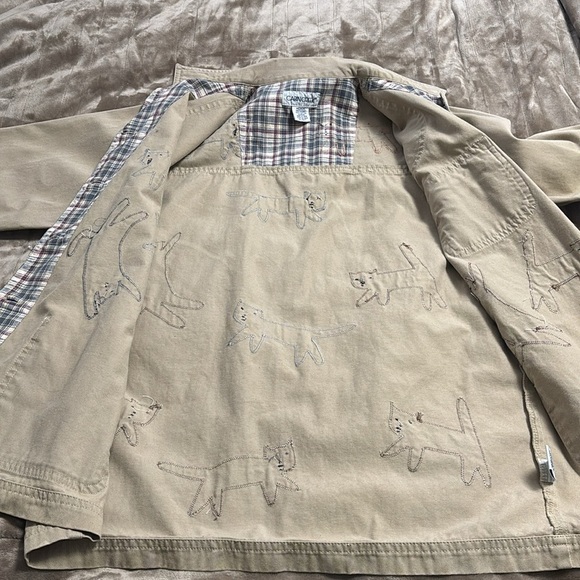 Super fun Cabin Creek cat coat. This is in like new condition. There is one really small snag on the bag, see pictures. This is 100% cotton with a canvas like feel, it has cat patches embroidered all over it. This is a medium with an oversize fit.
