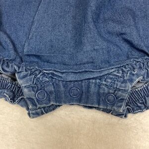 Euc light weight denim look ruffle summer bubble romper snap crotch button front 6/9m no stains, tears, holes fade or wash wear