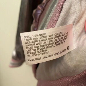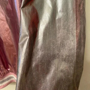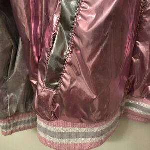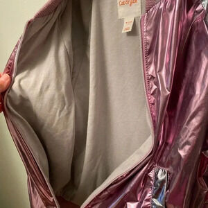 Cat & jack silver and pink shiny lightweight zip up jacket medium 7/8 ribbed cuffs, neck, and bottom. Very good condition. The silver shows a little bit of dullness/streaking due to the nature of the fabric, see pics. Tons of life left in this cute little glam jacket.