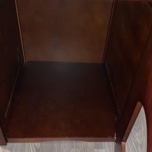 Fully assembled cat litter box enclosure with a top shelf and a silver metal bar on one side (to hang stuff or w.e purpose). Door Opening for the cat to get in and out.