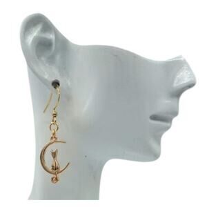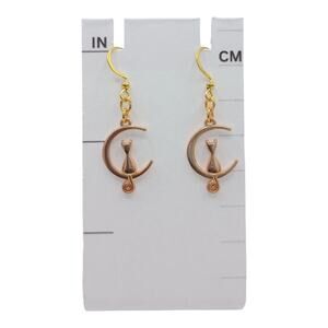 Channel mystical vibes with these crescent moon dangle earrings featuring a sleek cat design. The gold-tone finish makes them versatile while still adding a touch of witchy magic. Lightweight and stylish for everyday wear or spooky season.