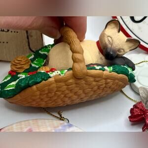 Includes a 1996 Hallmark Keepsake Siamese ornament, a porcelain Keith Kimberlin, wood and resin ornaments, and some vintage