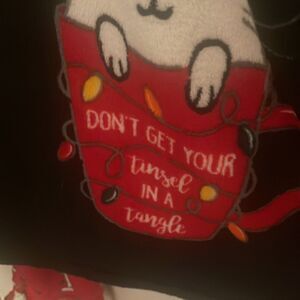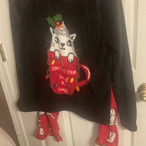 Cat Christmas Pjs NWOT size Medium 8-10 Only washed Very soft material says don’t get your tinsel in a tangle perfect for cat lovers Price Is priced for offers price is negotiable