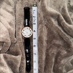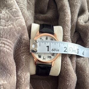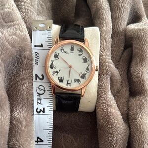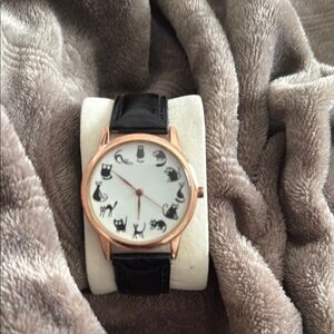 Chic watch featuring a playful cat design on the dial. Elegant black strap adds a classic touch. Leather band still intact tact no peeling no cracks on dial