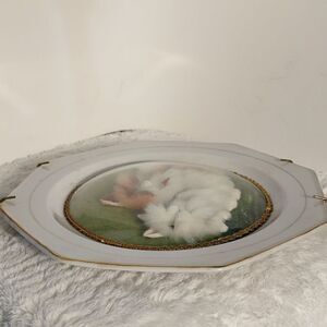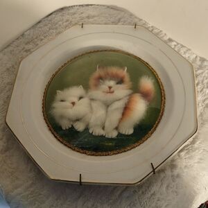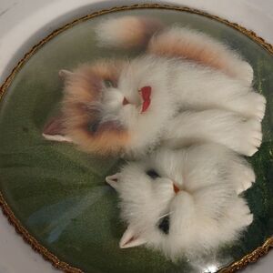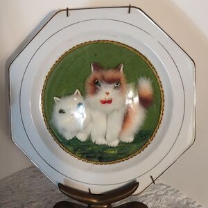 This homemade two faux fur cats decorative wall plate measures approximately: 10" x 10". Adorable hobbyist piece. All offers are welcome.