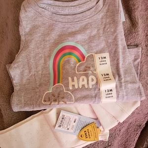 These are brand new girl clothes from the Target brand Cat & Jack in a size 12 months. It comes with a set of pajamas and one long sleeve & leggings. (2 outfits) Both tops are ivory and have a rainbow on them. The pajama bottoms are fleece like. The leggings have silver holographic glitter on them.