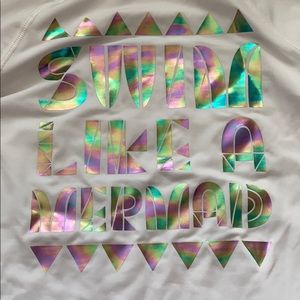 Perfect quality rash guard with pretty holographic writing “swim like a mermaid”