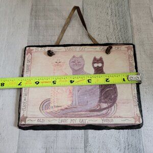 A charming slate plaque adorned with whimsical cat illustrations, perfect for adding a touch of feline elegance to any space. The leather strap provides a rustic accent, making it a stylish home accessory.