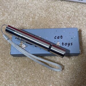 The cat laser toy is USB charged and has multiple lights (Red pointer, UV and LED) - see pictures. It has an on/off switch so you don’t have to hold down a button to keep it on.