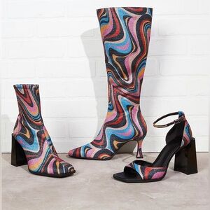 Vibrant knee-high boots with a swirl pattern. Features a mix of pink, blue, yellow, and black colors. Perfect for making a bold statement.