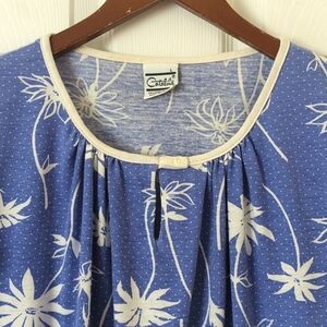 VTG and straight out of the 90s - This super cute top was made in the USA to feature a scoop neck with a keyhole detail, short sleeves with slits and ties at the cuffs, an elastic hem, and a relaxed, boxy fit! It is purple in color with a white floral and dot print. Extremely comfortable, lightweight and soft! Pairs great with shorts and sandals for a retro look. Classic, casual, and high quality!
