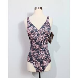 This swimsuit is designed to flatter your figure! I love the ruching on the sides! The shades of pink and gray are so cute and the low back is sexy! Best of all, the original tags are still attached! Marked size 12, 85% Antron Nylon 15% Lycra Spandex. No noted flaws!