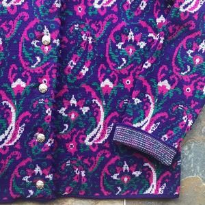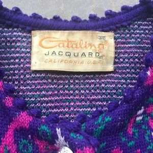 Catalina Jacquard Vintage Sz 38 Cardigan Pink Purple Art Deco 50s 60s, silver metal buttons. In excellent used condition for its age, no stains or rips. Does have a couple of almost snags, very minor. The tag has some wear to it. Please look over pictures before purchasing