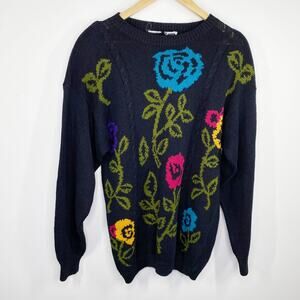 Vintage navy blue floral knit crewneck sweater. Crew neckline, long sleeves, knit construction. Shoulder pads.