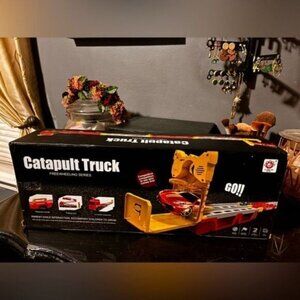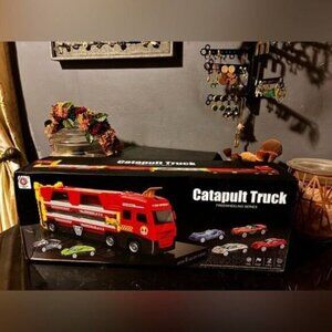 Exciting Catapult Truck Freewheeling Series toy set in vibrant red. Perfect for imaginative play and adventure. Includes six alloy cars for endless fun.