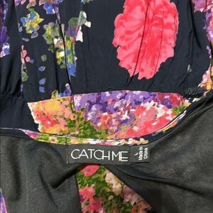 Stylish floral dress with a deep V-neck. Features vibrant pink and purple flowers on a dark background. Perfect for a chic look.Runs small.. Pit to Pit 17” Length 30” Good Pre-Owned Condition