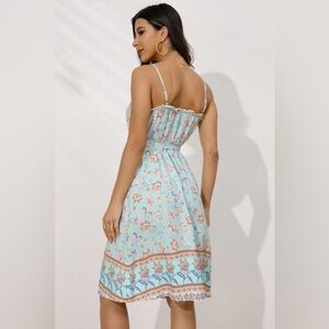 Treat yourself to a stylish new look with this casual dress. Taking inspiration from the bohemian style, this stylish dress features a touch of festival chic. The light floral print adds plenty of color to this timeless style. The square neckline features a bold pattern that compliments the rest of the dress. A midi length brings the full length of the dress to perfection. The spaghetti straps create a stylish silhouette that is also easy to wear. This piece is perfect for work and leisure. Pair with some heels for an elegant yet casual look.