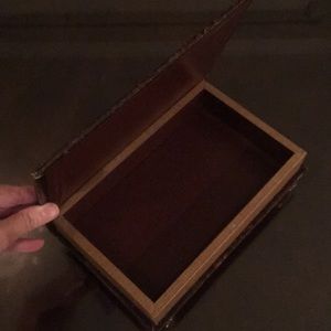 Decorative catchall. Perfect to store keys, jewelry, keepsakes, etc. Looks nice on nightstand, office desk, hallway table. Feels like leather. Great gift idea (maybe for Father’s Day:) My mom made it. She’s great with arts and crafts! It’s unique. Looks like book, but has legs that are actually doorknobs. I have one in hallway that I use for keys.