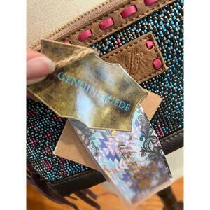Catchfly crossbody purse featuring a colorful woven beaded front with turquoise and pink pattern accents, 100% leather suede trim, and fringe details on the sides. Compact yet functional, this bag includes a top zip closure, adjustable crossbody strap, and a bright interior lining with a zip pocket for small essentials. A fun statement accessory ideal for casual outfits, travel, or festival wear.