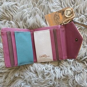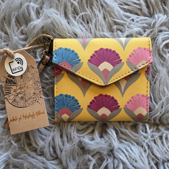 Vibrant wallet with a unique pattern. Features yellow, pink, and blue colors.