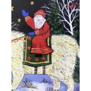 Whimsical father Christmas, atop a polar bear waving as he wanders through the forest.