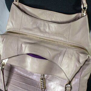 The front of the bag has crocodile embossed leather pocket with a snap closure