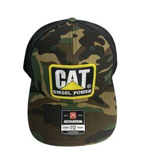 Caterpillar CAT Trucker Hat. Richardson 112 Camo / Black mesh back adjustable strap.