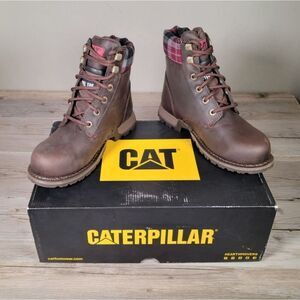 Find style and strength in a work boot made just for women. With a plaid covered cuff, this work boot has all the appeal of a trendy combat boot with the durability of a classic work boot. Made with industrial work applications in mind, this steel toe boot is engineered using Cat Footwear's patent-pending Technology® construction, offering work boot durability with athletic shoe comfort. It also features the time-proven strength of Goodyear welted construction in the forepart, and an EVA heel cup which provides cushioning shock absorption where you need it most. It meets the needed safety requirements with a steel toe and electrical hazard protection but is designed to be stylish as well. It's built to the Cat standards of durability and comfort, and the rubber outsole is slip-resistant to meet the needs of a messy worksite. The Kenzie work boot is a great alternative if you want something that will set you apart on the job.
