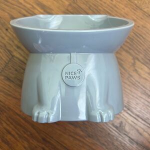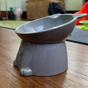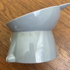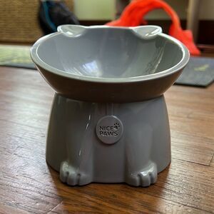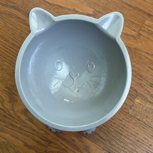 Raised cat food dish, has a small slant to it. New, my cat didn't like it !