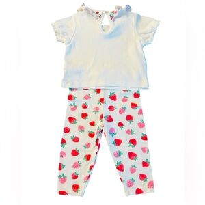 Charming kids matching set by Cath Kids London . Features a white top with ruffled collar. Pants adorned with red strawberry print. Soft and cozy.