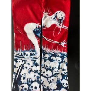 Standout red graphic pants from Catharsis – Size 34 – brand new with tags. These feature a surreal, haunting design with white ghost-like figures, screaming faces, skulls, and flames across the lower legs. Made for anyone into punk, goth, or alt streetwear vibes.