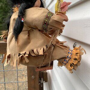 They were designed by professional artists, and delicately handcrafted with the finest materials.They are both Native American dolls with black hair, one has straight long hair and the other doll has braided hair. They are both wearing faux deer hide outfits with fringe, beads and faux fur details. They are both wearing headbands with a plastic flower and feather details. On their feet are moccasins. (one moccasin is missing). They are marked on the back of their necks...Cathay Collection 1______5000 meaning they are one set of a limited 5000 distributed worldwide. The dolls measure around 10" sitting and have porcelain heads, arms and legs. The swing has twine hangers. They dolls also have twine attached to keep them sitting on the swing. A really cute kissing doll collectors set!