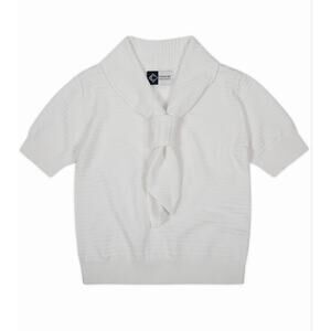 Elevate your wardrobe with this Cathcart London sailor-style blouse, crafted from a premium cotton-silk blend for a lightweight, silky feel. The ribbed knit texture adds dimension, while the statement bow tie neckline channels vintage-inspired elegance. The structured collar enhances its polished appeal, making it a perfect choice for preppy, classic, or modern styling. Pair it with high-waisted trousers or a sleek skirt for an effortlessly sophisticated look. This ivory-hued top is a timeless addition to any collection, ideal for workwear, casual outings, or elevated everyday wear.
