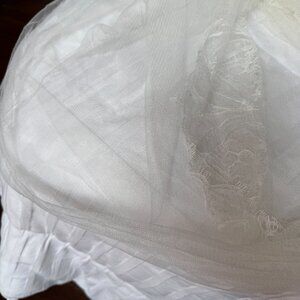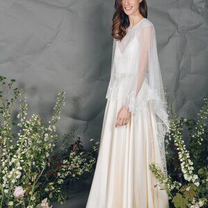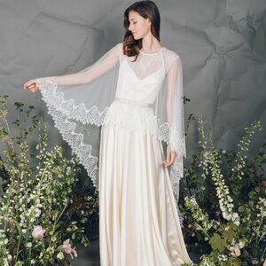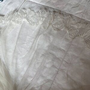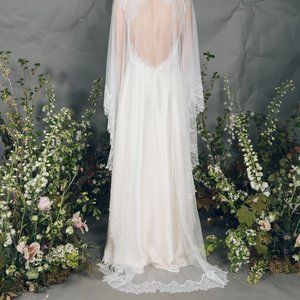Beautiful, lace-edged mantilla cathedral-length wedding veil. One layer tulle. Custom made by Helen Martin for Kate Beaumont. Never worn as it didn’t go with my dress (although it was removed from and returned to the bag). Soft gold comb sewn into the lace. Bought for $450. (Happy to send more photos - hard to take considering the length!)