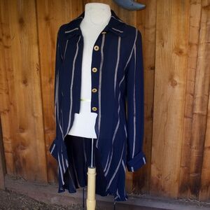 Perfect condition, new without tags. The only sign of wear shown on this garment is at the wrist; please view last photo. Thoughtfully designed 100% silk button down blouse with ties for a belt. A doubled up collar and cuff at the sleeve, high low hemline, victorian in style or Pirates of the Caribbean vibes. Almost a pinstripe. This designer is known for her painted silk clothing. Size is extra small, fits up to a small.