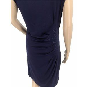 Catherine Maladrino Midi Sheath Dress L Cap Sleeve Embroidery Navy Blue Stretchy
