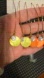 3 pairs of earrings with gold tone long threaded hooks. Each features a marbleized disc in yellow, peachy orange, strawberry red. A tiny freshwater pearl sits on top of each disc. Very lightweight.