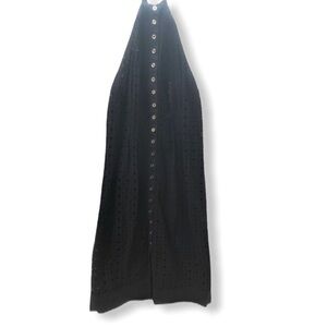Lined. No size tag. I lightened the photos to show details. Neck line to bottom in front is 39 inches, pit to pit is about 15 inches