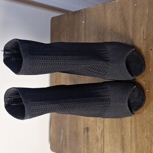 Elegant black strechy knit boots with peep-toe design. Stylish, sexy, unique, and glamorous. Fit like a glove, won't slip, pull on, 4" heel. In excellent pre-owned condition, worn only a couple of times.
