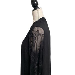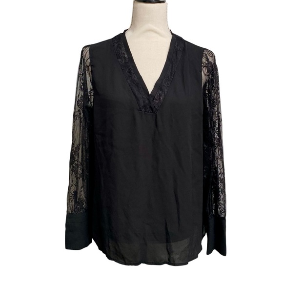 Catherine Malandrino Black Lace Blouse Sheer Floral Sleeves V-Neck Top Size L