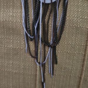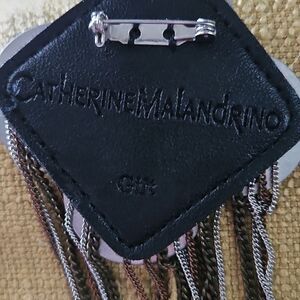 Catherine Malandrino's art deco like multi chain brooch has black leather and black netting and makes a great addition to any outfit.
