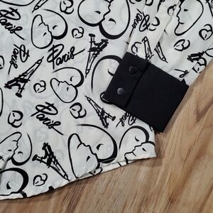 Cream snap up Parisian themed blouse. Long sleeves with black collar and black cuffs with a double snap closure.