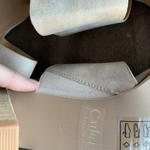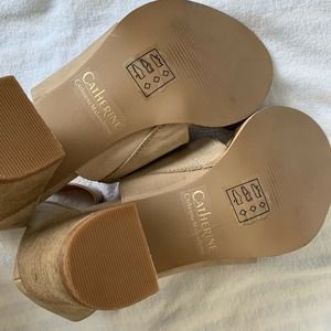 Catherine Catherine Malandrino D’Orsay Pumps Beige Popo Stacked Heel Open Toe Sandals Size 7 with a 3" heel.