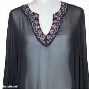 Catherine Malandrino Embroidered Black Sheer Bell Sleeve V Neck Blouse Top L